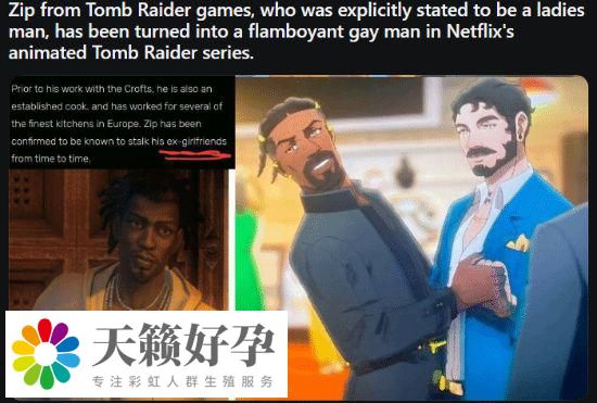 有網友指出,游戲《古墓麗影》中出現的人物澤普(Zip)也在動畫劇中登場,游戲中他的設定是勞拉 · 克勞馥的得力助手和技術專家,并被被明確描述為一個花花公子。然而,澤普在動畫劇中卻變成了一個男同性戀。
